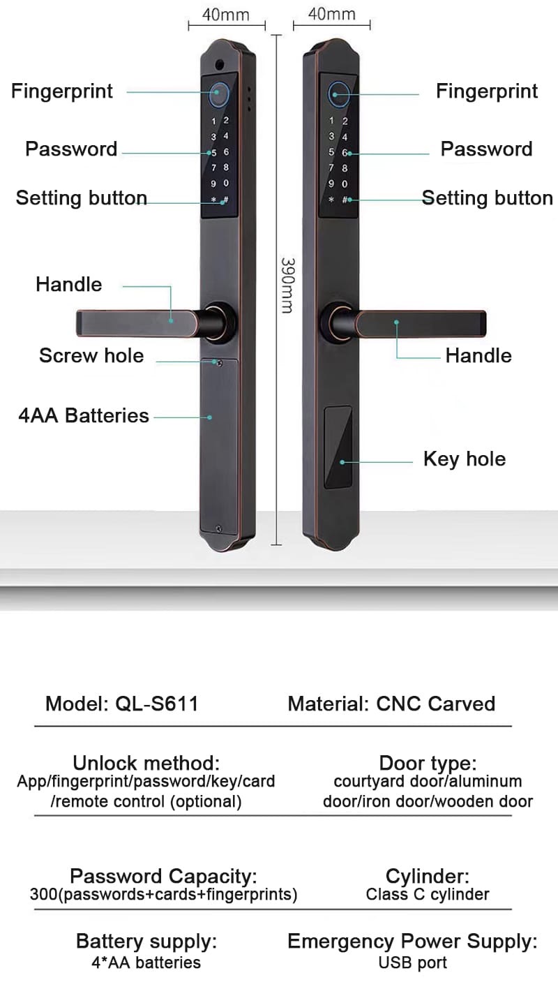 Tuya WiFi APP, Fingerprint, Password, Card, Key, USB port
